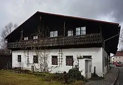 Der Böhmerwald lieferte das Baumaterial für die Blockbohlenhäuser. Die Balken wurden früher mit einem breiten Zimmermannsbeil behauen und zu späteren Zeiten gesägt. Die Eckverbindungen der Hauswände waren überwiegend gezinkt und selten verschränkt. Die Innenwände wurden in die Außenwände eingezapft und meist verputzt.[3] Die weitausladenden Satteldächer mit geringer Neigung waren früher „Legbretterdächer“, bei denen die Dachdeckung mit Steinen beschwert wurde. Später wurde auch mit Holzschindeln eingedeckt, die heute fast alle durch Ziegel-, Schiefer- oder Blecheindeckungen ersetzt sind. Die West- und Straßenfassaden waren ebenfalls mit Schindeln als Wetterschutz bzw. zur Zierde verkleidet. Die Schindeln erhielten dann runde, geschwungene oder spitze Schmuckformen.[3] Der Balkon im Dachgeschoss führte über die gesamte Breite des Hauses. Er wurde mit geschnitzten Balkonbrettern verkleidet.