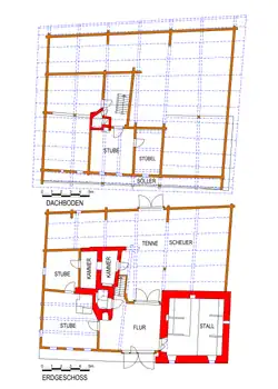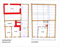 Die große Stube und das kleinere Stübl lagen an der Südseite (oder Straßenseite) des Hauses, dahinter schlossen sich Kammern und die Küche an. An einem der Schornsteine war die Räucherkammer (Selch genannt) angebaut. Der Stall lag zentral an einer Seite des Hauses. Gegenüber lag die Futterkammer. Den rückwärtigen (nördlichen) Teil des Hauses bildeten Heustock, Strohstock, Stadel (Scheune) und die Holzlege.[4] Unterkellert war nur der Wohnbereich. Der Keller und die Fundamente waren in Bruchsteinmauerwerk ausgeführt. Später wurden auch Teile des Wohnbereichs, die Küche und der Stall mit Mauern versehen. Nach dem großen Brand von 1863 wurde das gesamte Erdgeschoss oft in Mauerwerk ausgeführt. Zu den landwirtschaftlichen Anwesen gehörten noch weitere Bauten aus Holz: Nebengebäude, Scheunen und Unterstellmöglichkeiten für Gerät. Auf den Wiesen gab es Heustadel, in denen das Heu bei Unwettern rasch eingebracht werden konnte. Sie dienten beim Heumachen und nach dem großen Brand auch als Notunterkunft.