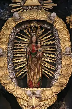Den Innenraum prägen Sgraffito-Malereien mit Régence-Motiven. Die drei spätbarocken Altäre sind konzentrisch angeordnet. Der Hochaltar zeigt das Gnadenbild der Muttergottes, welche von einem Strahlenkranz und einer doppelten Wolkenglorie umrahmt ist. Beim Gnadenbild handelt es sich um eine spätgotische Madonna, welche um das Jahr 1530 aus Lindenholz geschnitzt wurde. Ihre Fassung stammt aus der Barockzeit und imitiert Brokatstoffe. Über dem Gnadenbild sind das Auge Gottes und darüber das vom Schwert durchbohrte Herz Mariens angebracht. Der Tabernakel des Hochaltars stammt aus der Rokokozeit. Die beiden Seitenaltäre sind in ihrer Form an den Hochaltar angepasst. Die Altarblätter wurden um 1845 von Johann Füglistaller im Nazarenerstil erneuert. Der rechte Seitenaltar zeigt die Heilige Familie, der linke Seitenaltar stellt die Eltern der Gottesmutter dar, Joachim und Anna. Gezeigt wird die Szene, in der Anna ihre Tochter Maria unterweist. Über dem Chorbogen steht in einer Nische eine barocke Figur des Jesusknaben. Der Volksaltar stammt aus dem Jahr 1983.[3]