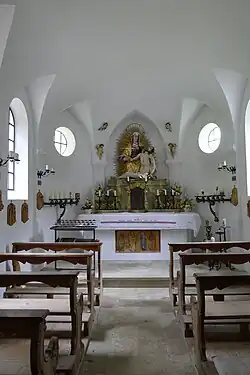 Die Kapelle besteht aus einem einfachen Saalbau mit etwa sieben Meter Länge bei einer Breite von etwas über drei Meter und einer halbrunden Apsis. Außerdem einem Anbau mit einer kleinen Sakristei. Kirchenbänke bieten Platz für etwa 16 Personen. Sie ist mit Schindeln gedeckt, auf dem Westgiebel sitzt ein Türmchen aus halb Erker, halb Dachreiter mit einer Zwiebelhaube und einer Glocke. Die Fassaden sind verputzt, das Schiff weist drei Rundbogenfenster und zwei kleine runde Fenster in der Apsis auf.