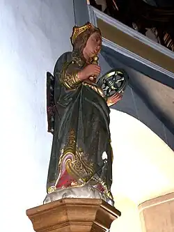 - Die heilige Katharina am Eingang ist eine farbig bemalte Sandsteinskulptur und entstand um 1500. Sie hat eine Höhe von 80 cm und gilt als Patronin der Vorgängerkirche.