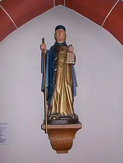 - Auf der anderen Seite des Eingangs befindet sich ein Standbild der heiligen Dymphna. Die 95 cm hohe, farbig bemalte Eichenholzfigur entstammt der Volkskunst des 15. Jahrhunderts. Dymphna wird als vornehme junge Bürgerstochter dargestellt. Der bärtige Mann mit Krone zu ihren Füßen stellt ihren Vater als den besiegten Dämon dar. Die Farbgebung erfolgte im 19. Jahrhundert.
