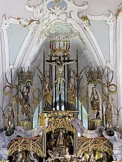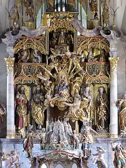 Erhalten geblieben ist der dreiteilige Schrein des spätgotischen Hochaltars mit den zum Teil lebensgroßen herrlichen Schnitzfiguren und dem reichen Gesprenge (Flügel und Unterbau mit Predella gingen verloren, stattdessen erhöht nun ein marmorierter Sockel mit eingebauten Schränken den Schrein). Die alte große Marienfigur in der Mittelnische entfernte man zugunsten einer neuen raumgreifenden Komposition – des Gnadenbilds, einer sitzenden Muttergottes um 1490, umfasst von einer Rokokostrahlengloriole mit Engeln und Putten.