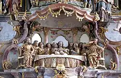 1762 berichtete der Vilser Pfarrer Lukas Gech an den Generalvikar nach Augsburg, dass sein Vetter Seyfried „erst heuriges Jahr eine ausbündig schöne Canzel, der gleichen auff dem Lande nicht leicht anzutreffen“, hergestellt habe.[4] Damit ist jedenfalls die Datierung des Prachtstücks, nicht jedoch die Urheberschaft gesichert. Die bisherige Zuschreibung an Pfrontener Bildhauer ließ sich nicht beweisen. Vielmehr zeigte eine genaue Analyse aller Details, dass die gesamte Kanzelplastik von Johann Richard Eberhard und seinem Vater Melchior Eberhard ausgeführt wurde.[7]