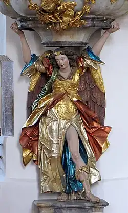 Zum anderen wurde auch hier ein älteres Kunstwerk perfekt integriert, nämlich der große Engel, der die Kanzel zu tragen scheint. Wohl keine andere Allgäuer Figur aus der Barockzeit hat in der kunsthistorischen Literatur ähnliches Interesse, gleiche Wertschätzung und so unterschiedliche Zuschreibungen erfahren wie dieser Kanzelengel. Neuerdings kann die prächtige Figur jedoch ohne Zweifel ebenfalls als Werk Christoph Schencks gelten (wohl 1619 entstanden, wie die Figuren des alten Tabernakelaltars).