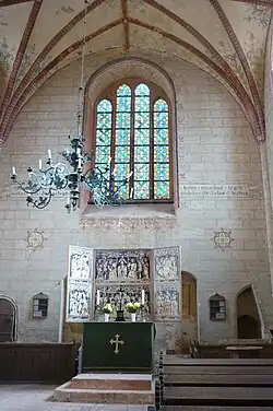 Der östliche Teil des Mittelschiffes wird durch ein Sterngewölbe überspannt, der westliche Teil und auch die Kapelle durch ein Kreuzrippengewölbe. Die schlichte Ausmalung stammt vom Ende des 19. Jahrhunderts. Ein farbenprächtiges Ornament-Glasfenster schmückt den Altarraum.