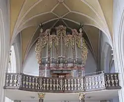 Auf der Westempore erhebt sich ein mächtiger barocker Orgelprospekt von einem unbekannten Erbauer aus der Zeit um 1730. 1994 wurde ein neues Instrument durch die Firma Rieger Orgelbau eingebaut, welches zum Kirchenpatrozinium Mariä Himmelfahrt am 15. August desselben Jahres eingeweiht wurde. Die Orgel mit mechanischer Spiel- und elektrischer Registertraktur umfasst insgesamt 31 Register auf zwei Manualen und Pedal. Die Disposition lautet im Einzelnen:[4][5]