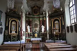 Der Hochaltar aus 1836 hat einen Säulenaufbau mit verkröpftem Gebälk, Vasen, Putti, und einem Volutenaufsatz, er zeigt zentral das Gnadenbild Mariahilf und im Aufsatz das Bild Mariä Heimsuchung, er trägt seitlich die Statuen Peter und Paul in einer Alabasterfassung aus der zweiten Hälfte des 17. Jahrhunderts.