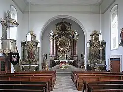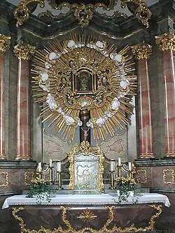 Der barock anmutende Hochaltar zeigt Maria mit dem Jesuskind, eingelassen in den Stamm eines Nussbaums, umrahmt von einem goldenen Strahlenkranz mit Wolken und Engeln, der von einer bildlichen Darstellung der Heimsuchung Mariä sowie vom Heiligen Geist in Gestalt einer Taube im Strahlenkranz einer Wolke bekrönt wird.