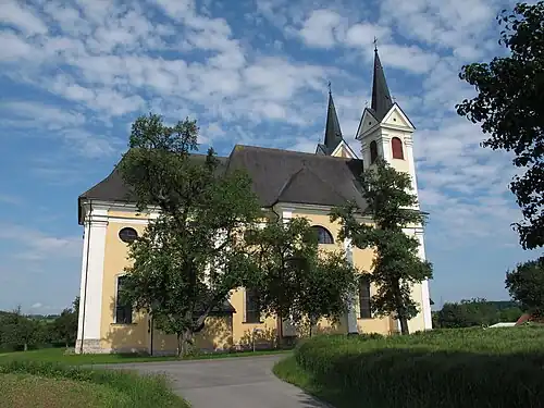 Das einschiffige, dreijochige Gotteshaus mit Stichkappengewölbe und eingezogenem Chor ist nach Westen ausgerichtet. Das Langhaus ohne Vorhalle ist 37 Meter lang, 14 Meter breit und 15 Meter hoch. Der Chor ist reich stuckiert, im Gegensatz dazu weist das Langhaus keinerlei Schmuck auf. Die Bildsäule des Bauern von 1682 rechts vorne war die Ursache der ersten Wallfahrt und trägt Fresken des hl. Florian und des hl. Leonhard sowie der Geburt und Kreuzigung Jesu.