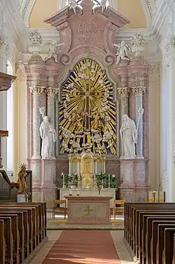 1687 wurde nach den Plänen des Barockbaumeisters Carlo Antonio Carlone der Bau begonnen. Am 16. Februar 1693 wurde die erste Messe im neuen Steinbau gelesen. Nach einer durch Geldmangel erzwungenen Pause, wurde in den Jahren 1700 bis 1702 die Arbeit fortgesetzt. 1702 fand die Glockenweihe statt und 1706 entstand der neue Hochaltar, ein Werk von Johann Bader. 1711 bekam der Hochaltar das von Johann Kutter feuervergoldete Kreuz.