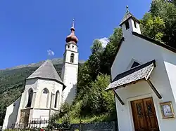 Das Langhaus unter einem steilen Satteldach hat westlich talseitig an der Lichtseite Rundbogenfenster und weiters rundbogige Oberlichtfenster über einem Gesims. Der eingezogene spätgotische Chor ist höher als das Langhaus und zeigt dreifach abgestufte Strebepfeiler, Spitzbogenfenster und Sockel- und Kaffgesimse. Der östlich beim Chor bergseitig stehende gotische Turm hat ein hohes Glockengeschoß mit spitzbogigen Schallfenstern und darüber einen achteckigen barocken Aufbau aus 1661/1668 mit einem Zwiebelhelm. Talseitig am Chor steht ein Sakristeianbau unter einem Pultdach. Das Langhaus hat ein gotisches Seitenportal mit einem Rundstabprofil und Verstäbung aus dem Anfang des 16. Jahrhunderts. Das Hauptportal ist wohl aus dem 17. Jahrhundert. Die südwestliche Chorschrägwand zeigt zur Zufahrt ein barockes Fresko Jüngstes Gericht.
