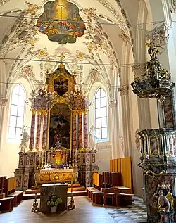Der Hochaltar, von Andreas Huter (1887), trägt die Reliefs Mariä Himmelfahrt und Heilige Dreifaltigkeit und die seitlichen Statuen der Heiligen Josef und Joachim sowie Putten und Engel auf dem Gebälk, alle von Andreas Kölle (um 1720). Der Tabernakel und Antependium mit Reliefs sind aus dem 19. Jahrhundert.