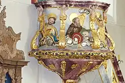 Die Kanzel zeigt die Kirchenlehrer und in der Mitte Papst Gregor I., den heiliggesprochenen Kirchenvater.