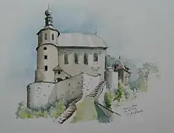 Die zwischen 1661 und 1663 erbaute Kirche ist einschiffig und vierjochig. Von der ehemaligen Wehrburg stammen der mächtige Rundturm und das Torgebäude, das sogenannte Priesterstöckl. Dieses besteht aus zwei Zimmern. Der Zugang zur Kirchenanlage, an der man noch heute den alten Wehrcharakter erkennen kann, erfolgt über eine Brücke. Am zweigeschoßigen Torgebäude sind Schießscharten angebracht. Der Kirchhof erstreckt sich auf zwei Felsplateaus und ist von einer Ringmauer umgeben.[2] Seit dem Jahr 2008 wird die Kirche renoviert. Die Innenrenovierung wurde mit der Weihe eines neuen Volksaltars am 10. Mai 2015 abgeschlossen.