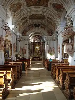 Der Innenraum präsentiert sich als einschiffiger Rechteckbau mit einem stark eingezogenen zweijochigen Chor. Zwischen die Wandpfeiler sind Emporen eingezogen, die im unteren Bereich je drei Seitenkapellen entstehen lassen.