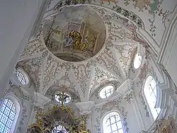 In eher handwerklicher Art zeigt Lederer im großen Deckengemälde des Langhauses, in dem er seinen Namen und das Jahr 1734 angibt, Maria als Helferin aller Stände, und in den zehn Bildern, die er um dieses Fresko gruppiert, sehen wir Frauengestalten, die als alttestamentliche Vorbilder Mariens gelten: