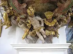 Die Kanzel (um 1735, zugeschrieben Ehrgott Bernhard Bendl) trägt reiche Dekorationen aus Bandelwerk und Rocaillen. Vor der Brüstung sitzen die vier Kirchenväter, auf dem Schalldeckel die vier Evangelisten. Darüber thront die Jungfrau im Strahlenkranz. Besonders volkstümlich sind die allegorischen Figuren der vier Erdteile am Kanzelfuß. Europa, Asien, Afrika und Amerika sind als dralle Putten dargestellt, Europa trägt eine große Krone und hält ein Szepter in der Hand, Amerika hält Pfeil und Bogen, Asien ist durch einen Turban charakterisiert. Afrika ist ein kleiner Mohr mit Federrock und Federkrone, der ebenfalls einen Bogen in der Hand hält.