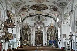 Die Stuckaturen stammen von Johann Baptist und Ignaz Finsterwalder (1733/34 und 1735). Die Dekorationen bestehen aus Bandel- und Gitterwerk, Kartuschen, Blattranken, Blumengehängen, Engelsköpfen und anderem. Über dem Chorbogen sind die Wappen der Fürstbischöfe Heinrich von Knöringen, Johann Christoph von Freyberg und Alexander-Sigismund von Pfalz-Neuburg ausgearbeitet. Die Stuckaturen der Sakristei gehen noch auf Caspar Feichtmayr (1669/71) zurück und bestehen aus Vierpässen mit Rosettenfeldern in Leistenrahmen.