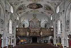 Das einschiffige Langhaus wird von einem flachen Stichkappengewölbe überspannt. Seitlich öffnen sich die Wände zu den Kapellen, im Osten leitet der schmale Chorbogen in die Rotunde über, die von den mächtigen Seitenaltären flankiert wird.