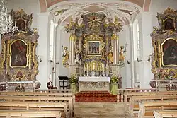 Der Innenraum wird durch das Stichkappengewölbe bestimmt, das auf Pilastern sitzt. Ein flacher Chorbogen öffnet den Blick zum Hochaltar, dessen Altarretabel mit einem Gnadenbild versehen ist. Die Orgel wurde 1979 von Mathis Orgelbau errichtet.[1]