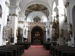 Das Langhaus besteht aus einem weiten fünfjochigen Saalbau mit Stichkappentonne auf breiten Wandpfeilern. Zwischen den Pfeilern befinden sich seichte Kapellen. Die Westempore ist kreuzgratunterwölbt und ruht auf toskanischen Marmorsäulen. Der Chor mit Halbkreisapside und Stichkappen über Pfeilern wird von einer Pendentifkuppel bedeckt.