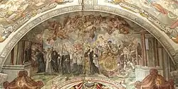 Das grosse Fresko am Chorbogen entstand 1687 und dokumentiert die Bedeutung des Benediktinerordens. Es zeigt einen Triumphzug Marias. Der Wagen wird von Benediktinern gezogen; an der Spitze steht der Ordensgründer Benedikt von Nursia. Dahinter folgen in aufsteigender Rangordnung heilige Mönche, Erzbischöfe, Kardinäle und Päpste. Die gefesselten Gefangenen hinter dem Wagen symbolisieren Häretiker und Schismatiker.