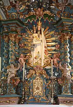 Das ursprüngliche Altarbild des Hochaltars, eine Heimsuchungsszene, wurde im Zusammenhang mit der Kirchenerweiterung von 1681 bis 1684 durch eine bekleidete Madonna ersetzt. In den Nischen stehen Figuren der Heiligen Martin (rechts) und Sebastian (links). Letztere stammt noch aus dem Vorgängerbau in Acladira. Das Bild der Heimsuchung hängt heute in der Werktagskapelle.