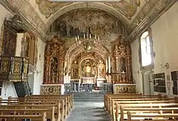 1687 bis 1690 wurde der Innenraum durch den Kirchenmaler Fridolin Eggert aus dem Kloster Disentis aufwändig ausgemalt; die Malereien gelten als sein Hauptwerk. Bemerkenswert ist das Bild im Chorhimmel, in dem durch das Zusammenfliessen der Milch Marias mit dem Blut ihres Sohnes in der Opferschale ihre Mitwirkung am Werk Christi symbolisiert wird.