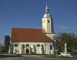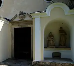 Vor der Kirche befindet sich der Florianibrunnen als oktogonales Brunnenbecken mit der mittigen Säulenfigur hl. Florian aus dem dritten Viertel des 20. Jahrhunderts.