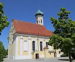 Der Bau des heutigen Gotteshauses erfolgte von 1754 bis 1755 nach Plänen des Baumeisters Johann Georg Hitzelberger.[4] Die Weihe vollzog der Augsburger Weihbischof Franz Xaver Adelmann von Adelmannsfelden. Die Deckengemälde schuf der aus Kempten stammende Barockmaler Balthasar Riepp. Von den Josephinischen Reformen blieb die Kirche unberührt, da sie nicht selten für die Filialisten die wegen Hochwasser die Pfarrkirche von Ziemetshausen nicht besuchen konnten, als Ersatzkirche diente.[5] Der Frühmeßbenefiziat Theodor Schafheitl machte dem Benefizium eine Schenkung von 1500 Gulden, mit der Auflage für sich, seine Eltern und Freunde jährlich vier Messen in der Kirche lesen zu lassen. Darauf vermachte sein gesamtes Vermögen dem Benefizium in Höhe von 25.213 Mark und 57 Pfennigen. Aus den Zinsen dieses Kapitals bezog der Benefiziat jährlich 950 Mark, mit der Auflage monatlich für den Stifter und dessen Eltern eine Messe in der Kirche lesen zu lassen.[6] 1828 hatte der Manualbenefiziat folgende Verpflichtungen: Die gestifteten Heiligen Messen zu lesen, mit Predigten und Beichten in der Pfarrkirche auszuhelfen, alle Samstage in der Wallfahrtskirche zu zelebrieren und den Beichtstuhl zu besuchen und am Marienfest zu predigen. Laut Dekret des Ordinariats vom 23. Januar 1833 musste der Benefiziat von Vesperbild falls nötig, auf verlangen des Pfarrers in der Pfarrkirche aushelfen und an Festtagen in der Mutterkirche die Heilige Messen lesen. Dagegen konnte auch die Wallfahrtskirche den Pfarrer als Aushilfe in Anspruch nehmen.[7]