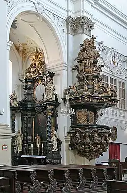 Die meisten Bildhauerarbeiten in der Kirche wurden von Franz Tollinger ausgeführt. Die barocke Kanzel aus dem Jahr 1714 stammt vermutlich von Franz Tollinger und ist reich verziert mit ornamentalen Schnitzereien und figürlichem Schmuck. Auf dem Schalldeckel der Kanzel befinden sich die alttestamentlichen Gestalten Moses, David, Daniel und Jesaja, darüber eine umfangreiche Figurengruppe zur Bekehrung des Saulus zum Paulus vor Damaskus. Über den Eingängen zu den Sakristeien befinden sich die Bilder zweier Jesuiten, die 1853 heilig gesprochen wurden. Das Bild gegenüber der Kanzel stellt den hl. Aloisius von Gonzaga dar. Die barocken Kirchenbänke mit ornamental geschnitzten Seitenteilen stammen aus der Zeit um 1730.