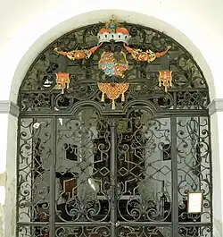 31. Bild: Das Bild an der Tür zur Jesuitenresidenz mit dem Gymnasium zeigt die Verehrung der Universitäten von Prag, Breslau und Olmütz. An den Seiten des Durchgangs befinden sich Statuen des hl. Johannes von Nepomuk und des hl. Judas Thaddäus.