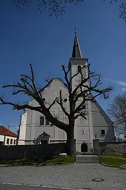 Die Kirche in der Ortsmitte ist von einer Wehrmauer um einen ehemaligen Friedhof umschlossen. Der mittelalterliche zum Teil barockisierte Bau besteht aus zwei zusammengewachsenen Kirchen. Die Westfassade ist rechts beim eben eingebundenen Turm leicht geknickt. Der Turm hat ein Obergeschoß mit einem Spitzhelm aus 1696. Der Chor des nördlichen Kirchenteiles hat zweifach abgetreppte Strebepfeiler und barocke Fenster. Der Chor des südlichen Kirchenteiles hat auch zweifach abgetreppte Strebepfeiler mit gotischen Spitzbogenfenster. Der gesamte Südbau hat eine etwas nach Süden verschobene Achse, was die Westfassade leicht knippt und die Ostseite etwas ausweitet. Die Fassade ist mit einer barocken Faschengliederung gestaltet. Das Hauptportal trägt ein Wappen Esterhásy im gesprengten Giebel und zeigt Maske und Ranken im Fries. Das Portal zur Turmkapelle ist aus dem Ende des 13. Jahrhunderts. Das Südportal aus 1502 hat einen spätgotischen Rahmen.