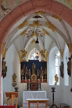 Der Hochaltar ist ein moderner Schrein aus dem Jahr 1959, er trägt als drei Schreinfiguren eine Madonna zwischen Quirin und Veit des ehemaligen spätgotischen Altares um 1510/1515.