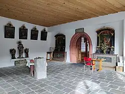 In der Vorhalle gibt es flankierend zum gotischen Portal zwei Biedermeier-Hausaltärchen, links mit dem Altarblatt Mariä Krönung mit den Heiligen Jakobus und Josef aus dem Ende des 18. Jahrhunderts, rechts ein bemerkenswertes romantisches Tafelbild der Heiligen Isidor, Wendelin, Notburga von Hans Kapferer 1850.