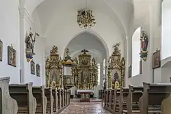 Die Ausstattung der Kirche ist barock. Die St.-Wolfgang-Statue mit Kirchenmodell, die Heiligenfiguren sowie der Hochaltar stammt von Johann Worath aus dem Jahr 1644. Die Gemälde wurden ebenfalls 1644 von David Stangl geschaffen. Die neubarocke Kanzel stammt aus dem 19. Jahrhundert.