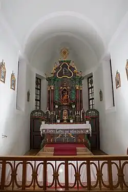 Der viersäulige Hochaltar wurde 1830 mit spätbarocken Stilanklängen errichtet. Der Altar birgt Georg Tinkhauser zufolge auch jene geschnitzte Muttergottesstatue aus dem 17. Jahrhundert, die Anlass für den Bau der ersten Kapelle war. Das Gemälde im Aufsatz zeigt den hl. Josef, auf der Mensa stehen Figuren der hll. Notburga und Theresia.[2]