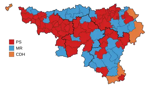 - ↑ CDH entstand 2002 durch Umbenennung der Partei Parti Social Chrétien (PSC).