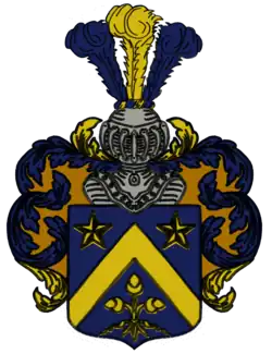 Das Schild ist in der Form „Tiercé en chevron“ aufgeteilt, das als Symbol für Schutz und der Erhaltung, kriegerische Tapferkeit, Beständigkeit und Festigkeit galt.[10] Die Tinktur des Wappens ist in Blau und Gold gehalten. Der goldene Sparren wird oben begleitet von zwei goldenen Sternen. Dazu unten ein Bund von drei goldenen Eicheln, die mit einem goldenen Band zusammengebunden sind. Der Helm ist in Silber gehalten und weist sieben Gitter auf. Die Helmzier besteht aus einer goldenen zwischen zwei blauen Straußenfedern. Zusätzlich ist der Helm mit blau-goldenen Decken umgeben.