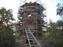 Das teilrekonstruierte Gebäude, ursprünglich ein Turm mit angebautem „Burgrest“, sollte die Ruine einer mittelalterlichen Burg darstellen. Es wurde aus romantischer Motivation erbaut sowie als Ausflugsziel. Das Ziegelmauerwerk des turmartigen neugotischen Gebäudes war ursprünglich verputzt. Der Turm diente als Aussichtsturm. Das Gebäude war als Landmarke von weither sichtbar. Ende des Zweiten Weltkriegs wurde ein Teil des Gebäudes, insbesondere der Erker und das Turmzimmer durch Artilleriebeschuss und Brandstiftung zerstört. In den Nachfolgejahren nutzten die Dessauer das Gebäude als Steinbruch. 1952 stand der Treppenturm noch und wurde bis 1954 abgetragen und ein Notdach aus Beton wurde auf das Hauptgebäude gesetzt. In der DDR zerfiel die Anlage weiter und wurde unter anderem zum Bergsteigen genutzt. In den 1990er Jahren machte Vandalismus dem Gelände zu schaffen. Die Sichtachsen wuchsen zu.