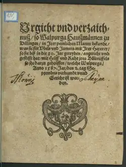 - ↑ Wolfgang Behringer: Hexenverfolgungen im Spiegel zeitgenössischer Publizistik : die „Erweytterte Unholden Zeyttung“ von 1590 (PDF; 4,5 MB), Oberbayerisches Archiv. – 109. 1984, 2, S. 339–360, Fußnote Nr. 47, S. 348.