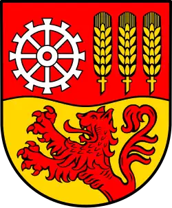Blasonierung: „Durch Wellenlinie von Rot und Gold geteilt, oben rechts ein silbernes Mühlrad, oben links drei senkrecht stehende Ähren, unten ein wachsender rotbewehrter und -bezungter roter Löwe.“[7] |