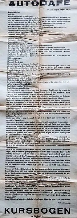 Als entschieden sozialkritischer Publizist erwies er sich nicht zuletzt in der Kulturzeitschrift Kursbuch, in der er 1968 – in einem „Autodafé“ betitelten Text, der der nr.15 des Kursbuch als Poster beilag und in vielen studentischen WG-Küchen hing – die Literatur und ihre Wirkung in einem historisch-gesellschaftlichen Kontext verortete:
