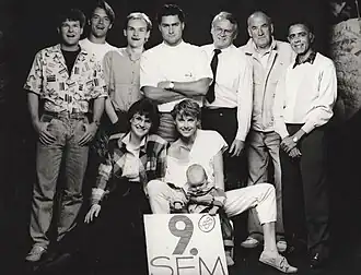 Gruppenbild aller Seminarteilnehmer 1988 des Seminar-Studio für Modefotografie - SFM mit Walter E. Lautenbacher (zweiter von rechts) und seinem Assistenten Marc Lautenbacher (zweiter von links).