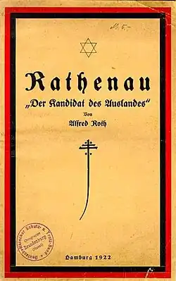 Nach 1945 wurde das Schlagwort von Rathenau als dem „Ersten Opfer des ‚Dritten Reiches‘“ populär. Dies bezieht sich einerseits auf die Vielzahl antisemitischer Anfeindungen, die Rathenau zeit seines Lebens über sich ergehen lassen musste. In völkischen und nationalistischen Kreisen galt Rathenau spätestens nach seiner Ernennung zum Außenminister als „Kandidat des Auslandes“ und Befehlsempfänger der Weisen von Zion. Der DNVP-Abgeordnete Wilhelm Henning hatte in der Konservativen Monatsschrift anlässlich des Vertragsschlusses von Rapallo geschrieben: „Kaum hat der internationale Jude Rathenau die deutsche Ehre in seinen Fingern, so ist davon nicht mehr die Rede. […] Sie aber, Herr Rathenau, und Ihre Hinterleute, werden vom deutschen Volk zur Rechenschaft gezogen werden.“[33]