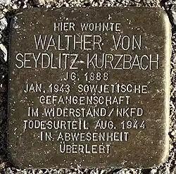 Das ehemalige Wohnhaus „Burgberg 3“ in Verden wurde abgerissen. Der erste (im Jahr 2011) verlegte Stolperstein für Walther v. Seydlitz-Kurzbach ging bei Bauarbeiten verloren, die Neuverlegung fand im September 2022 statt. Auf dem neuen Stolperstein fehlt die Information, dass v. Seydlitz-Kurzbach auch in der Sowjetunion zum Tode verurteilt wurde. Mit der Neuverlegung wurden auch Stolpersteine für seine Frau und die vier Kinder verlegt, zur Erinnerung an deren Sippen- und Gestapohaft und Internierungen in Kinderheimen.[12]