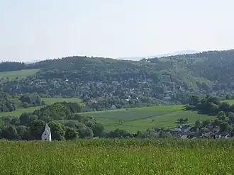 ![]() Wambach im Taunus von Westen, oberhalb von Bärstadt. Rechts im Hintergrund der Große Feldberg