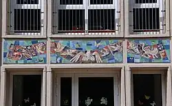 - In der ehemaligen Kommunalen Berufsschule für Fernmeldetechnik und Postwesen in der Gudvanger Straße gestaltete 1958 der Künstler Eduard Gerhardt Clauß in den Treppenhäusern und Korridoren des Gebäudes acht Verkleidungen für die dort installierten Wandzierbrunnen mit unterschiedlichen antiken und modernen Motiven. Folgende Motive wurden erschaffen. Vogelberg, Antike Welt, Der Garten, Die Quelle, Südliche Stadt, Komposition, Goldfische und Die Insel.[9] Die Ausführung dieser Wandbrunnen sind in Scharffeuer- und Schmelztechnik, mattglänzend. Der Künstler K. Schwarz aus Berlin gestaltete zudem das Erdgeschoss mit 16 abstrakten Elementen.