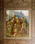 ![]() Dornröschen wird geboren – Symbol für den langen „Schlaf“ und die Erweckung des deutschen Reichs; darunter Grisaille: Dornröschens Taufe; der Dornröschen-Zyklus setzt sich über den Fenstern der Ostwand fort. |